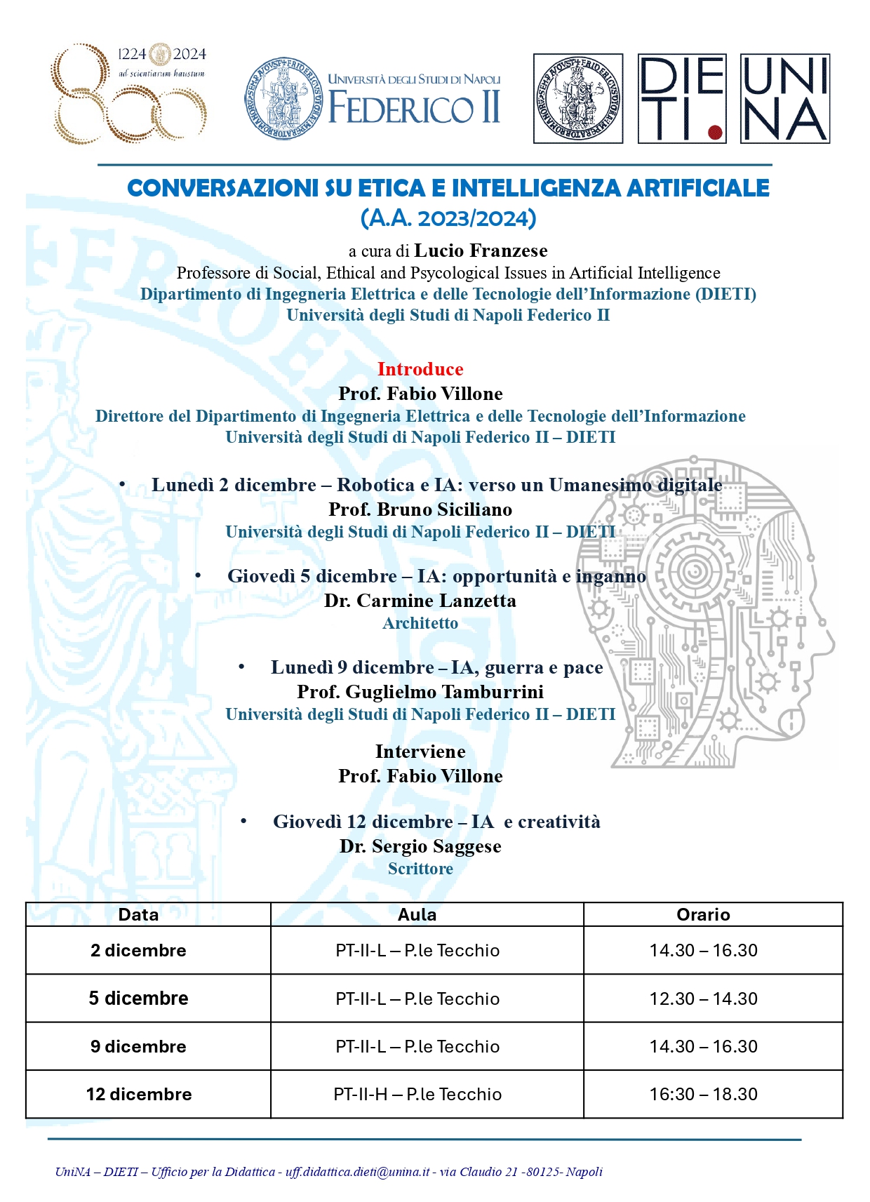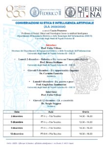 Ciclo di conversazioni “Conversazioni su etica e intelligenza artificiale” Università degli Studi di Napoli Federico II Ciclo di conversazioni “Conversazioni su etica e intelligenza artificiale” a cura di Lucio Franzese In allegato il programma completo.